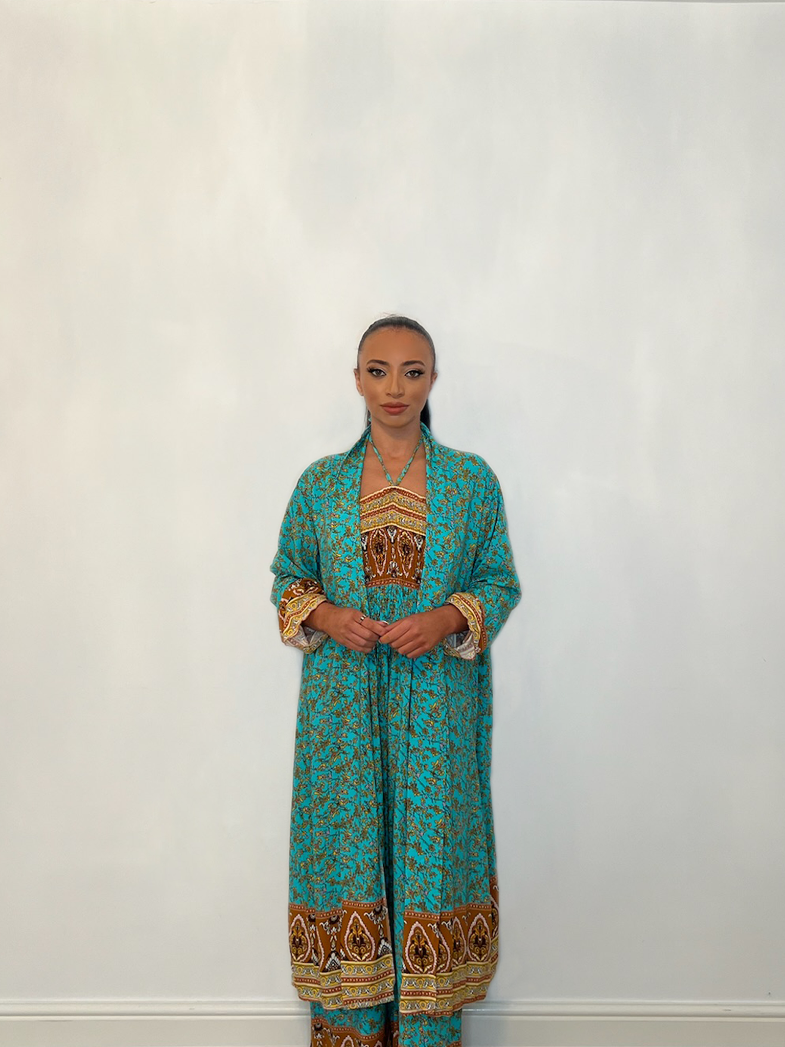 Unleash your inner queen with the CLEOPATRA JUMPSUIT SET, featuring a relaxed jumpsuit that promises both style and comfort. Tie design to make into halter neck dress if required. Additional duster coat for cover up, both items individually. Rule the day or night in this versatile and playful outfit.