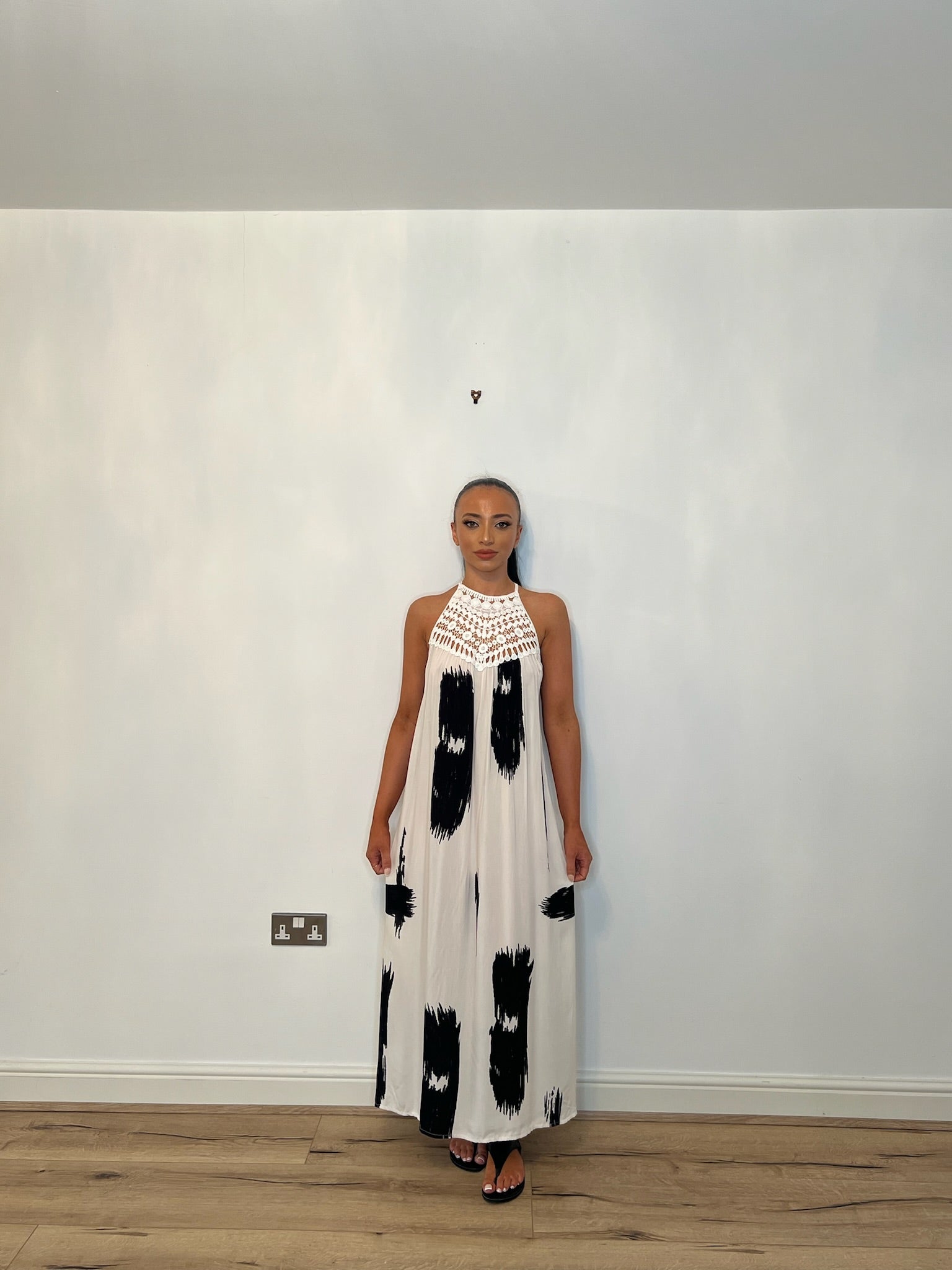 Unleash your inner fashionista with the LAYLA HALTER NECK DRESS. This elegant maxi dress features a trendy halter neck design, crochet neck detail and adjustable straps on the back. Perfect for any occasion!
