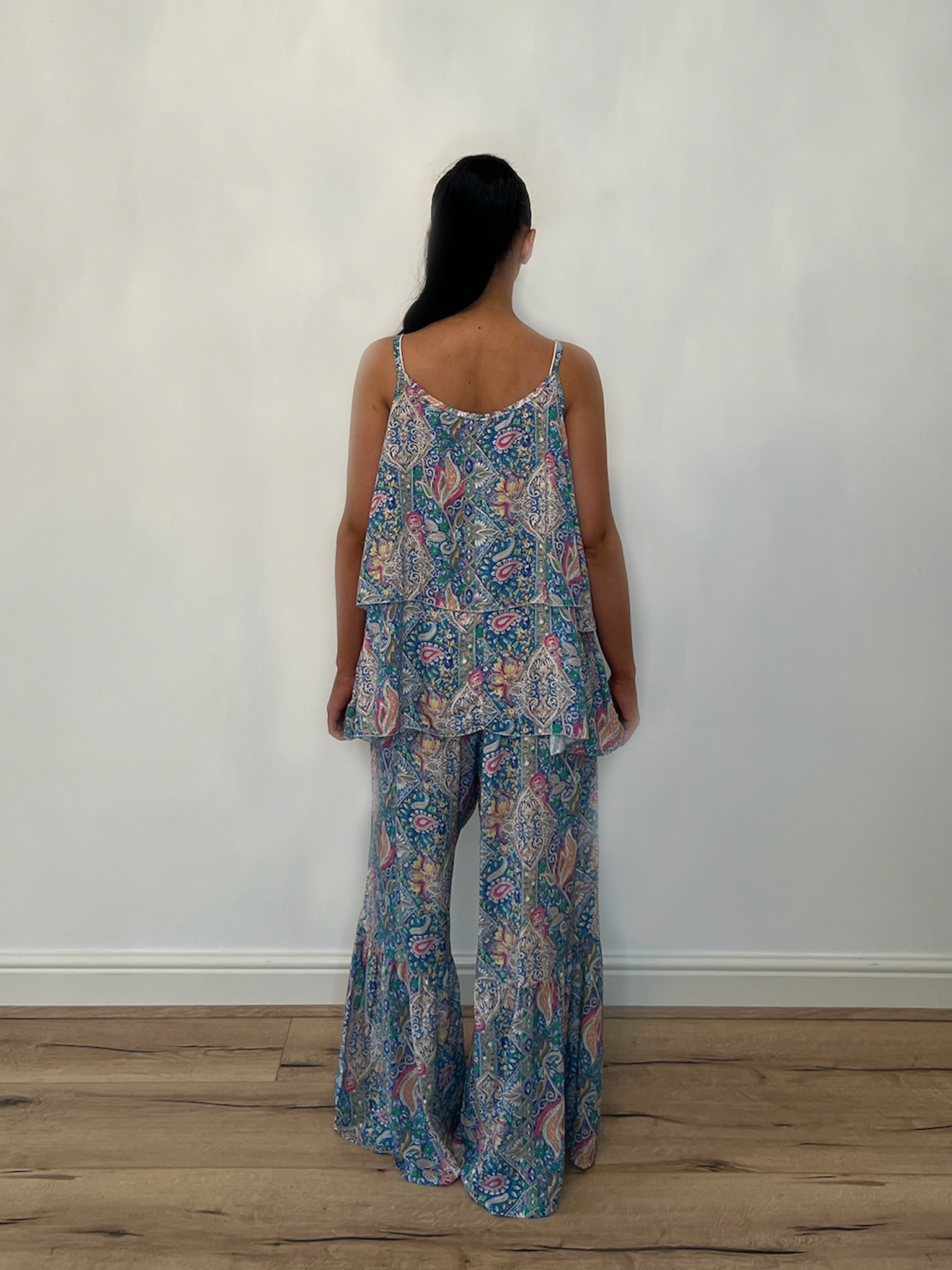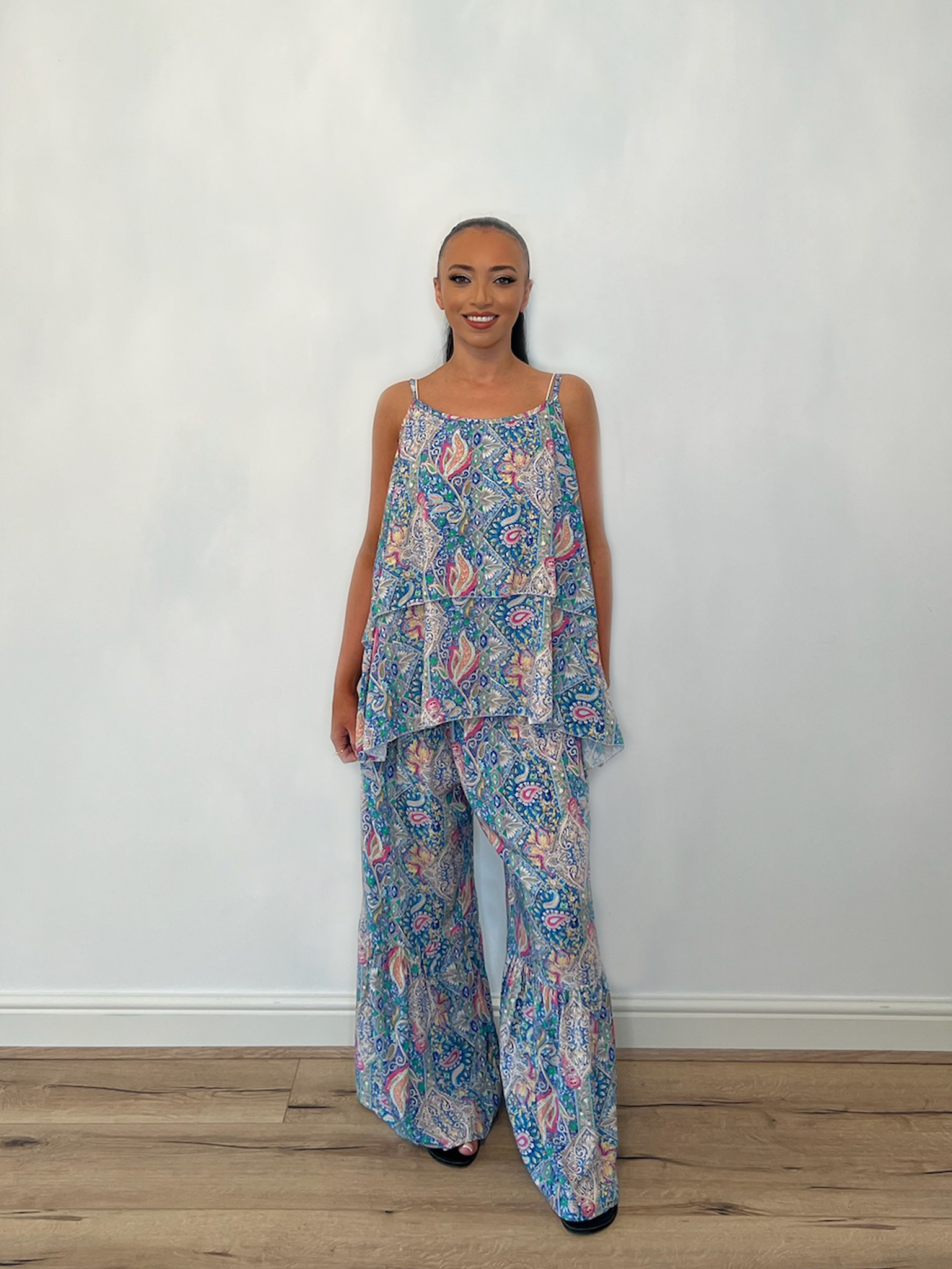 Get ready to spice up your wardrobe with the SIENNA SET! This stylish duo features the SIENNA top and bottoms, perfect for any summer occasion. Paisley print strappy overlay top, comfortable elasticated trousers.